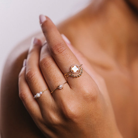 Interpreting the solitaire style, the Swan ring highlights a natural stone or plated gold pearl woven on a precious gold thread. With precision, handwork brings forth a rounded setting to cradle and elevate the central element of the jewel.